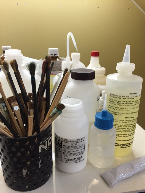 シミの種類や素材の種類など考慮しながら、何種類もの酸素系漂白剤と塩素系漂白剤などの薬品と毛の長さや堅さが違う筆を使い分け塗布していきます。